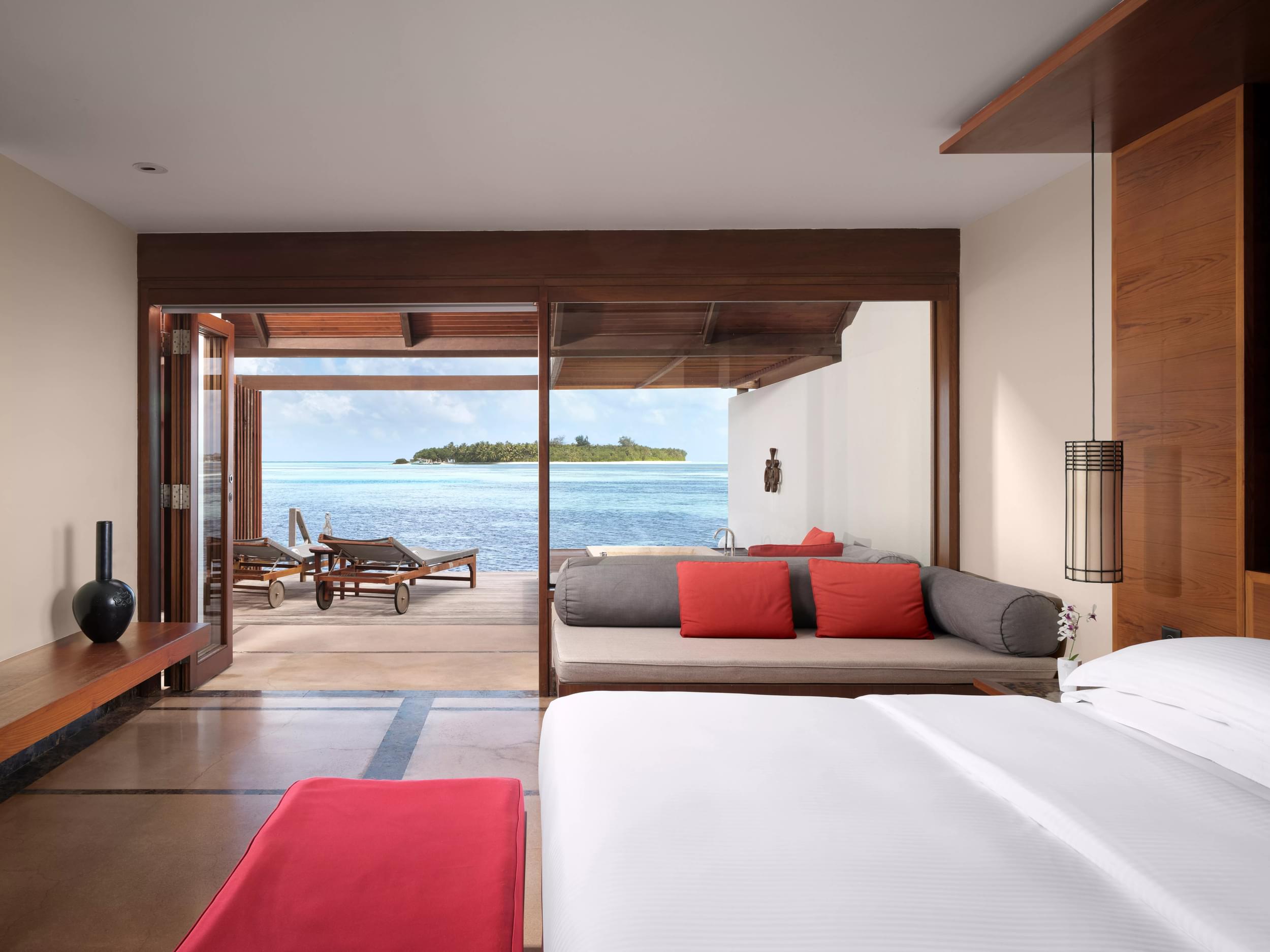 Water Villa: Nuestras villas sobre el agua son sinónimo de la libertad y la tranquilidad de vivir en un muelle. Despiértese con vistas al amanecer, descienda por la escalera privada a la laguna azul y pase los días relajándose en su solárium privado con la única compañía del aire marino y el sonido de las olas.
